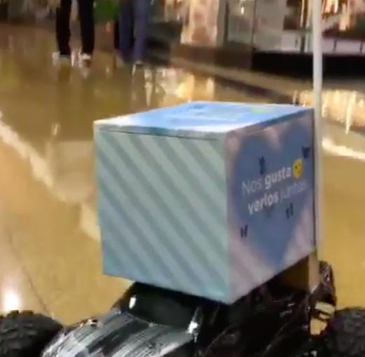 El carrito irá moviéndose por el lugar y se acercará a alguna persona para tocarlo. En ese momento la persona mirará y leerá sobre la tapa de la caja un mensaje que lo invitará a abrirla para descubrir el regalo sorpresa que se podrá llevar.